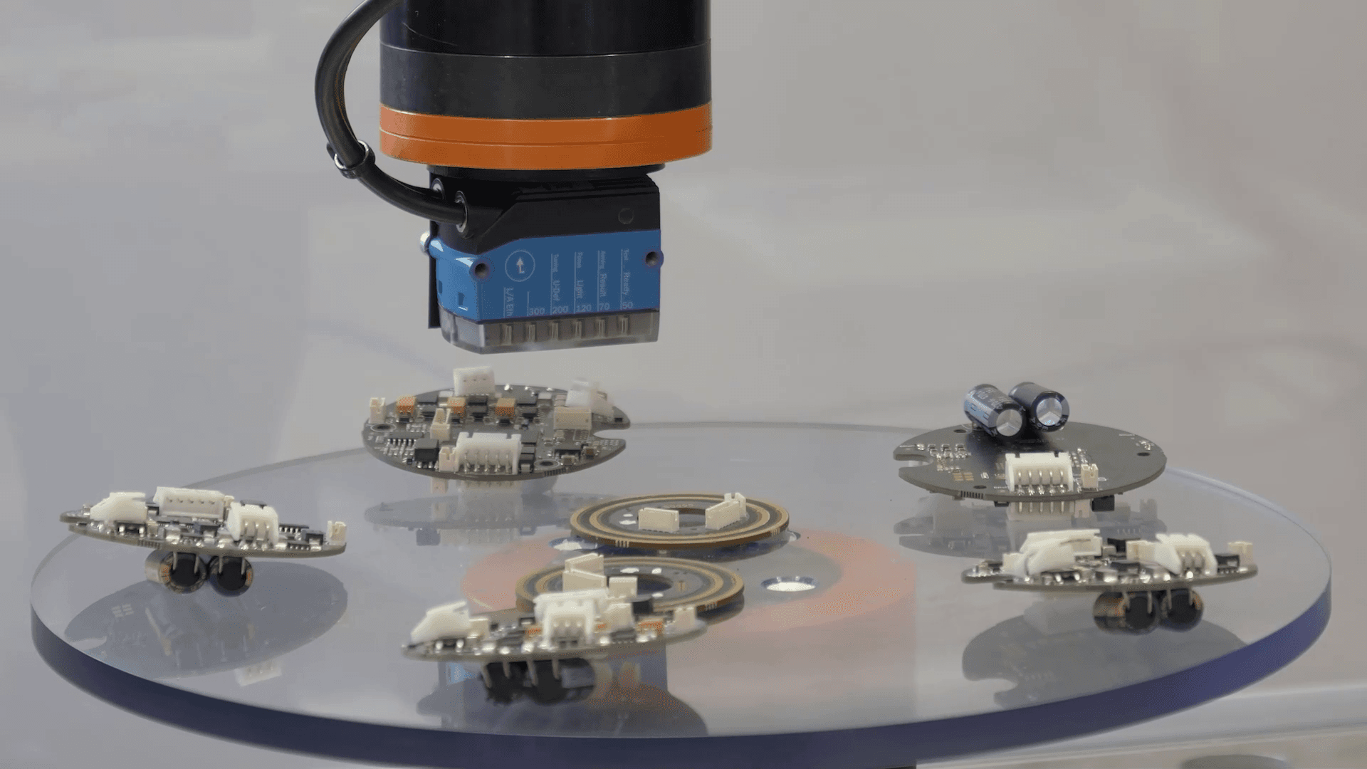 Our Low-Cost Complete Solution for Reliable Quality Control is a crucial aspect for manufacturing and processing companies to minimize costs associated with personnel and error prevention. To meet this need, igus® has developed a cost-effective complete system that enables automated testing of circuit boards. The system consists of an overhead-mounted ReBel® 6-axis robot, which is installed in a robot cell. To protect the cables, they were routed through a triflex® energy chain system. The circuit boards are placed on a disc, under which there is a wave gear - the same gear that is also used for the axes of the robot. The quality control is carried out by a camera system from SICK with a sensor for image analysis.